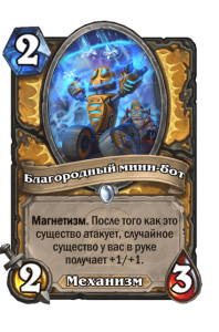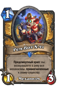 Аура даст Мех Паладину очень много темпа и возможностей создать неубиваемых мехов с помощью магнетизма. А если план не удастся, поможет другая новая карта — Рем-бот Х-21. Это отличный источник ресурсов для Мех Паладина, который идеально ложится в кривую маны с еще одной новинкой — Благородным мини-ботом.