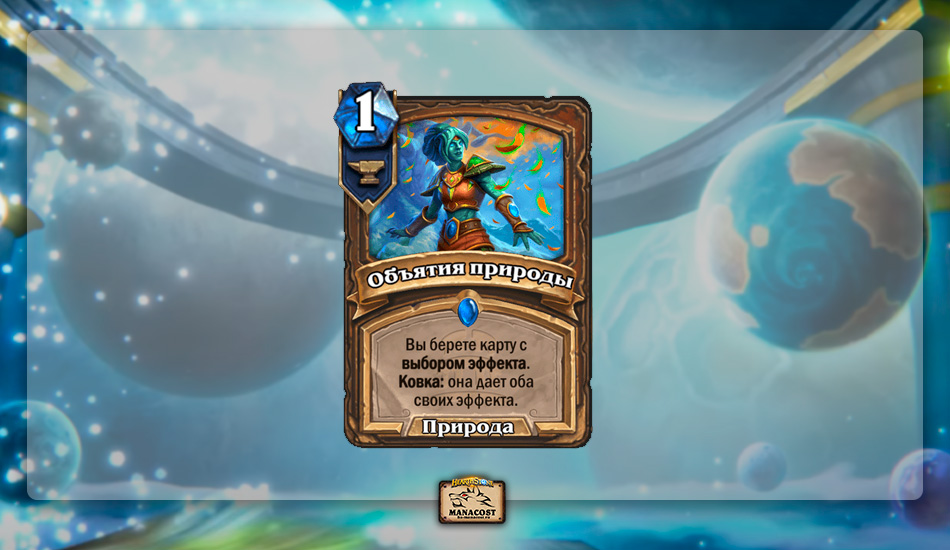 Объятия природы наверняка станут важнейшей картой Друида в ближайшие 1.5 года. Единственный минус карты в том, что ее надежный эффект удваивать силу дорогих карт с выбором, вроде Дара природы или Круга барабанов, может не помочь крутому Дару Хранительницы жизни, а наоборот — вынудить колоды отказаться от него.