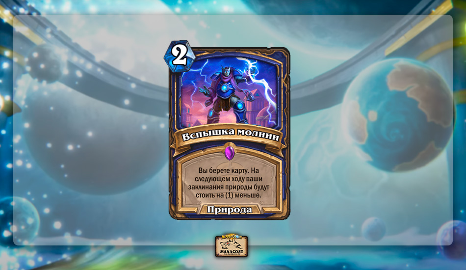 Одной из самых ярких карт, пардон за каламбур, является Вспышка молнии. Эффекты удешевления всегда сильно ценились в игре, а Вспышка молнии позволяет неизбежно сохранить такой эффект. При этом карта еще и перебирает колоду (хотя, как кажется, она была бы хороша и без добора).
