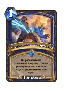 Также можно отметить, что заклинания природы, которые дает карта, случайные, а значит могут быть совершенно любого класса. Друид редко получает такую генерацию, и это может слегка разнообразить его геймплей. Большинство карт природы, отличных от Друида, это заклинания Шамана. Но иногда можно получить и какой-нибудь Водоворот, что тоже будет неплохо.