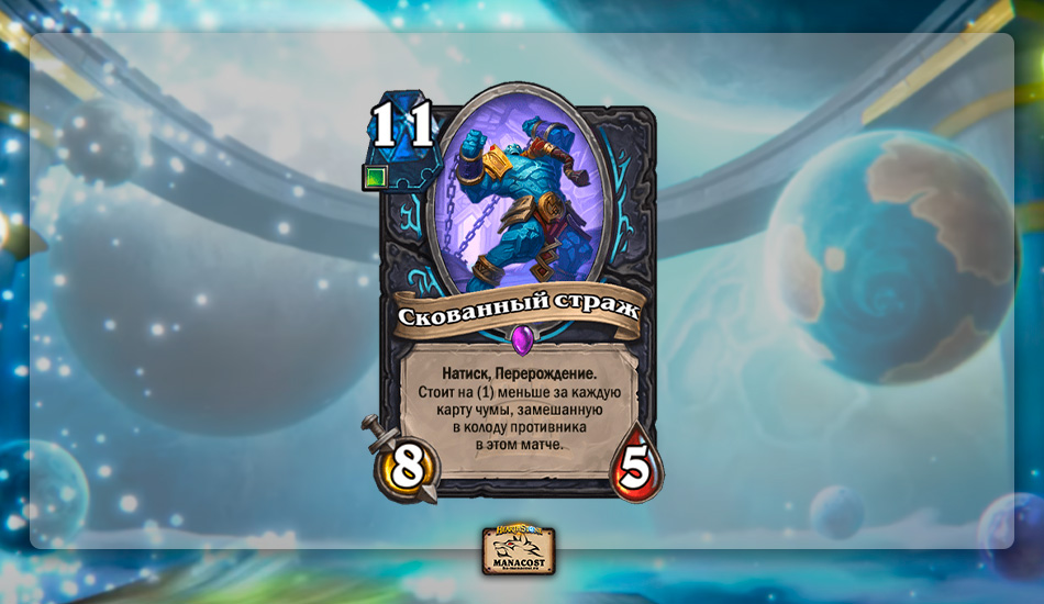 Этим рывком как раз-таки является Скованный страж, и пока что он видится главной причиной, по которой чума может заиграть в целом. Подобные колоды с медленной механикой и без контрольного плана на игру не могут существовать без карт, которые за копейки выбрасывают на стол много характеристик. Поэтому, если вы рассчитываете на механику чумы, лучше надеяться на то, что Скованный страж будет удешевляться достаточно быстро, чтобы вовремя успеть к битве. Хорошо, что у карты есть натиск, и она моментально ворвется в битву.