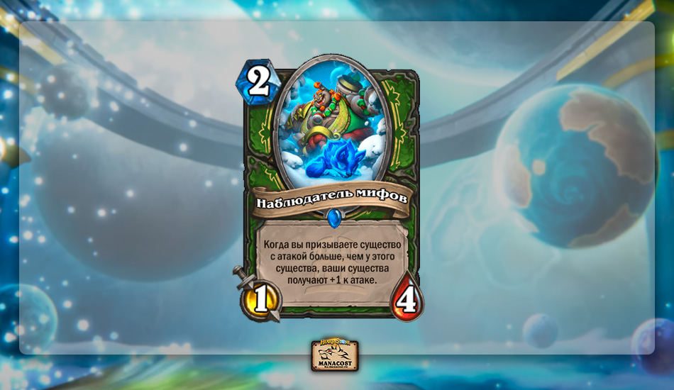 В отличие от какой-нибудь Жажды крови Наблюдатель мифов опасен тем, что он может выйти на стол прямо на 2-м ходу. А когда вы начнете призывать других существ, вы получите хотя бы один, а чаще — 2 или даже 3 баффа.