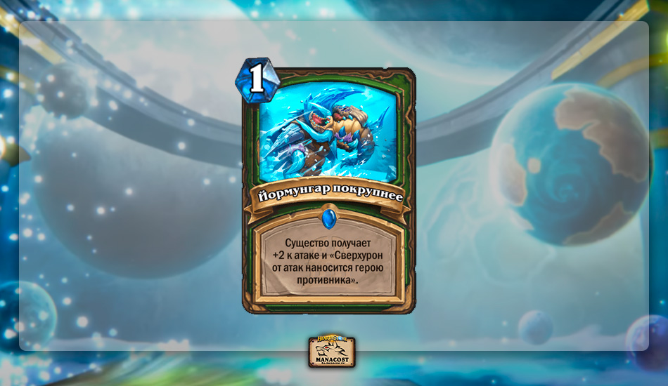 Еще одна интересная карта — это бафф на взрывной урон. У Охотника уже были карты, которые позволяют разменивать стол и вместе с тем наносить урон — Сопутствующий ущерб и Неистовый люторог. Йормунгар покрупнее позволяет превратить любое существо в люторога. Достоин ли такой эффект целой карты в колоде — покажет практика.