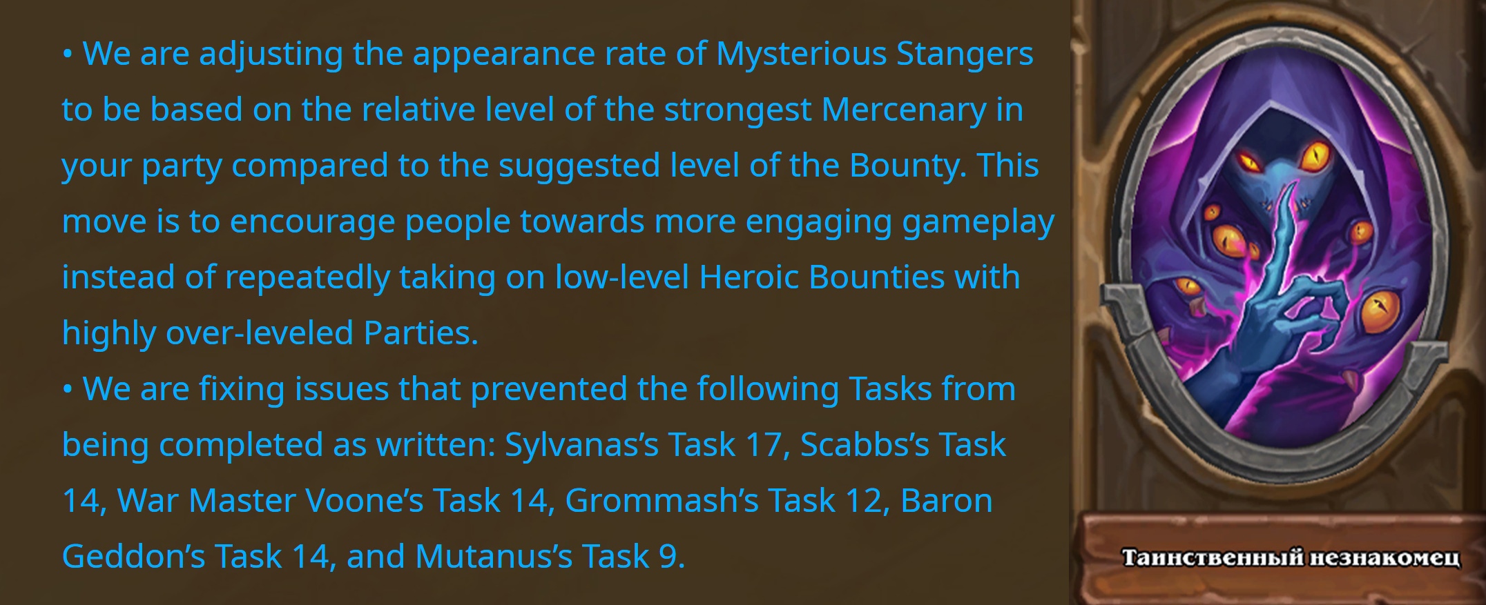 Теперь частота появления «Таинственного незнакомца» будет зависеть от уровня самого сильного Наемника в отряде относительно рекомендуемого уровня для прохождения босса. Другими словами, шанс его выпадения из «Загадки» станет ниже, если уровень Наемников в вашем отряде значительно выше указанного на поручении. Таким образом, стратегия с прохождением «Элементаля воздуха» в героическом режиме Степей (или «Барака Кодобоя» в обычном) для получения заданий Наемников больше не будет так эффективна. По словам разработчиков, этим изменением они хотят подтолкнуть игроков к более увлекательному геймплею вместо многократного прохождения низкоуровневых боссов.
