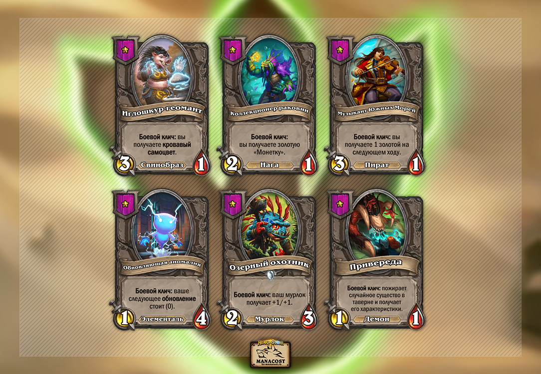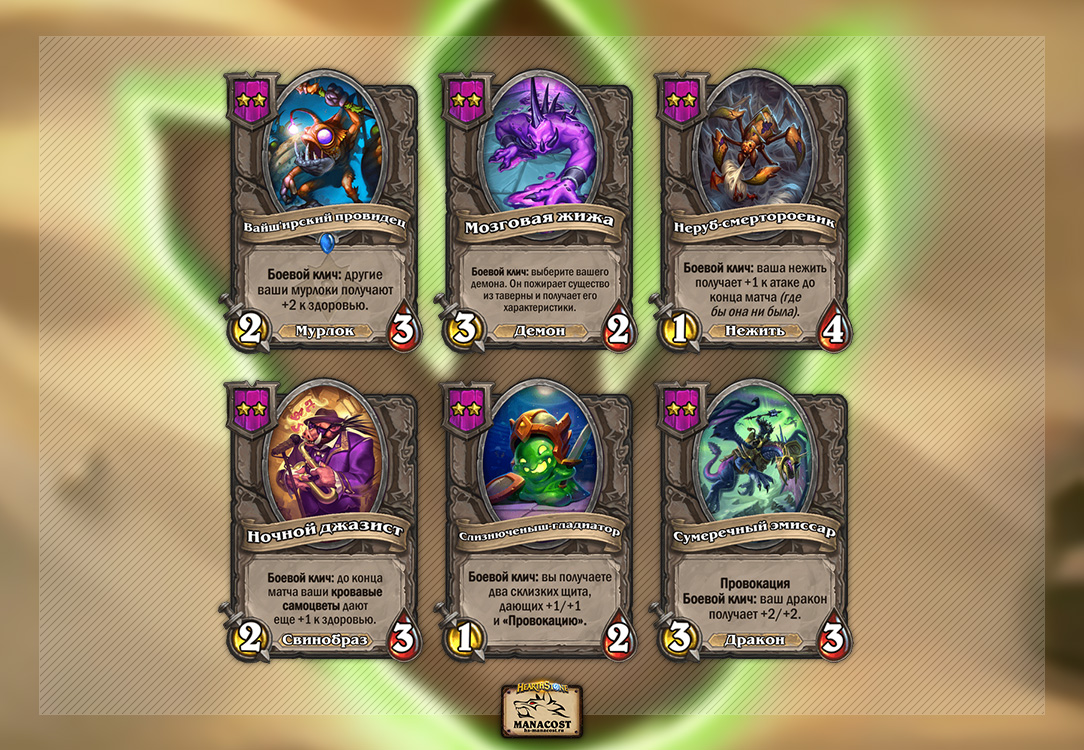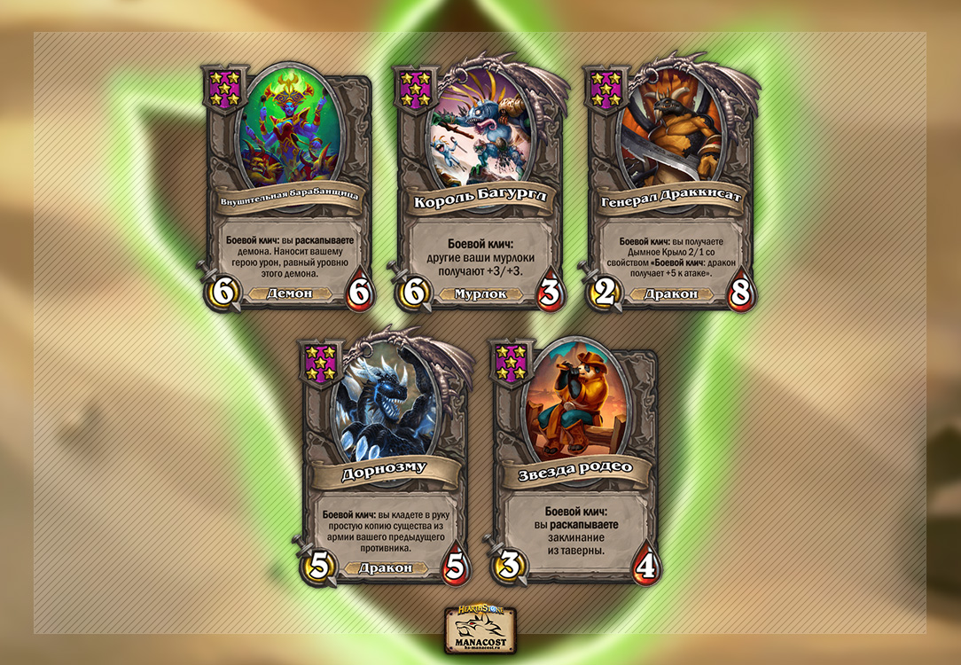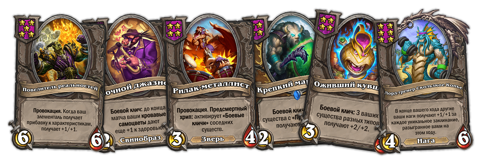 В начале партии Бранн Бронзобород обычно предпочитает дольше оставаться на 1-м уровне таверны, потому что тут есть много боевых кличей. Впрочем, это справедливо не для всех типов существ, о чем мы говорили выше.