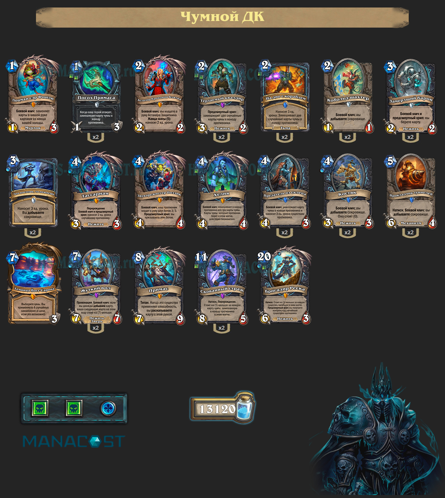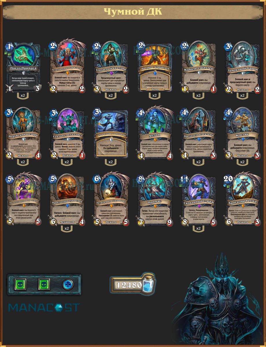 Самая популярная сборка Чумного ДК не меняется уже много патчей. Колода состоит из двух синергий — карт для замешивания чумы, добычи и их синергий. Сектант-металлист остается полезной картой в текущей мете: он поможет против Паладина, Рыцаря смерти и других темповых противников.