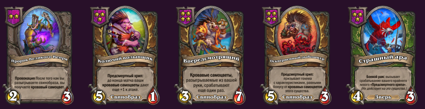 Основа стратегии — Осквернённый дыбошкур. Впередсмотрящий, Колючий вольнщик и Пророк Великого Вепря помогают нашему существу становиться значительно сильнее с каждым ходом, а Страшный ара дополнительно активирует способность Осквернённого дыбошкура. Стратегия эффективна благодаря отсутствию необходимости в существах тир-5 или тир-6.