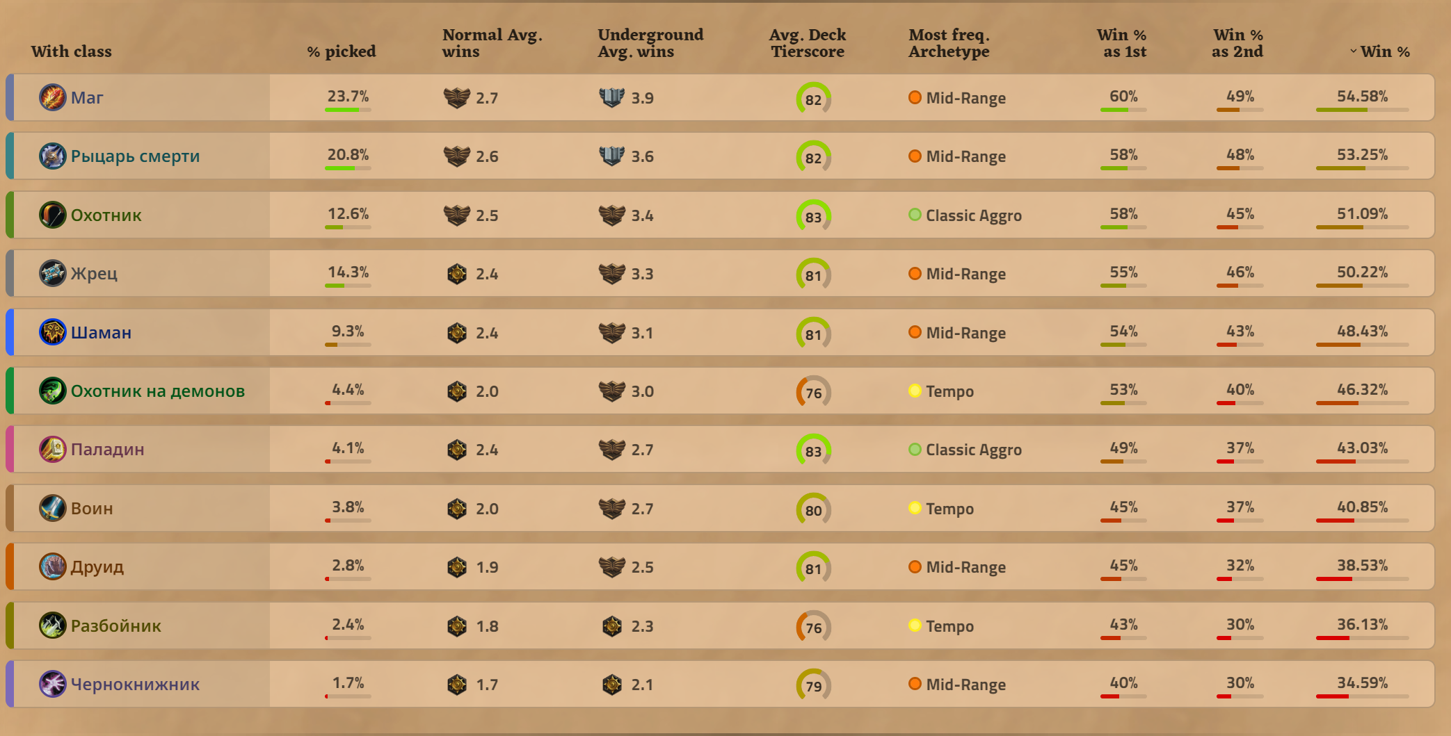 За ней следуют Рыцарь Смерти и Охотник, которые также показывают высокий винрейт.