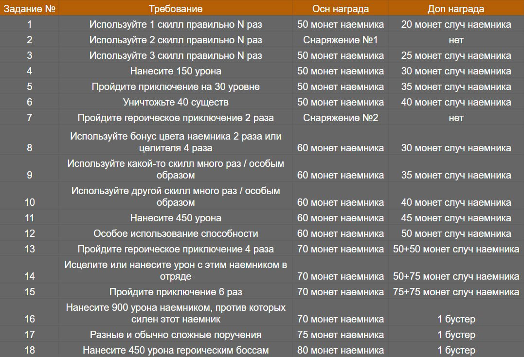 Ниже представлена таблица с типовыми заданиями и наградами, которая применима для большинства наемников (может отличаться у отдельных героев).