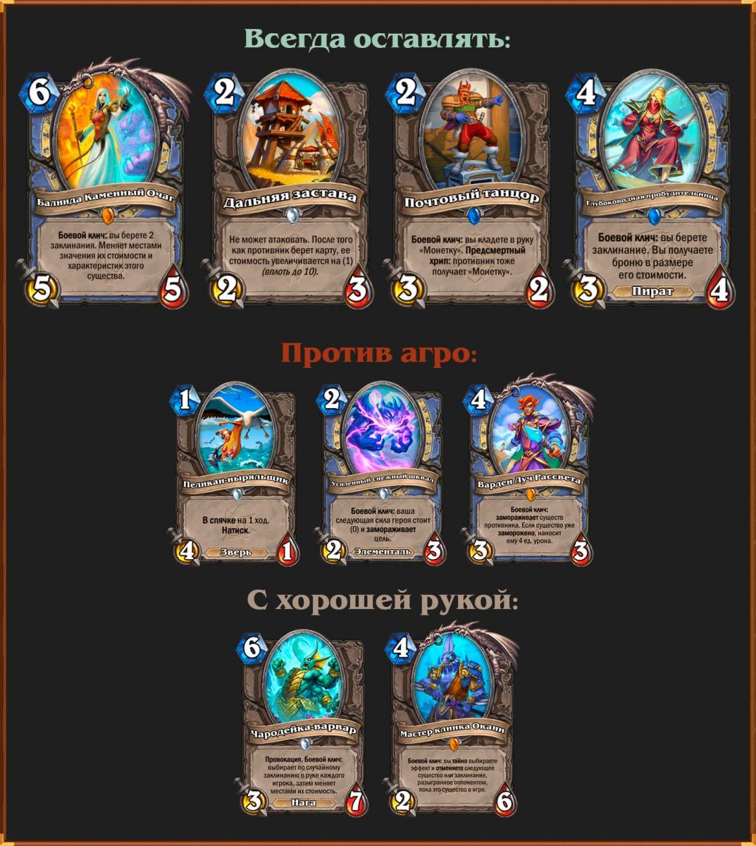 С Чародейкой-варваром все несколько сложнее. Для ее активации требуется уже полученное дорогое заклинание в руке. Кроме того, желательно знать, какие заклинания играет противник, чтобы не попасть впросак с обменом стоимости. Большую помощь в этой ситуации оказывает Глубоководная пробудительница, которая и доберет спелл, и поможет с выживаемостью.