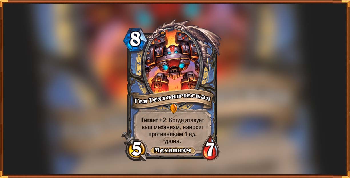 Гея Техтоническая — сильная карта сама по себе. Только два механизма 2/3 с натиском дважды активирую особую способность Геи и нанесут всем персонажам противника 2 урона — в том числе и герою. Не бойтесь играть эту легендарку без других союзных механизмов на столе, особенно если вы отстаете по темпу или ищите летальный урон.