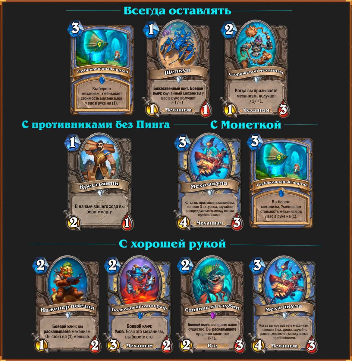 - Слияние из глубин — оставляют только в случае, если на первый ход в руке уже есть Щелкун или Сторожевой механизм через Монетку.