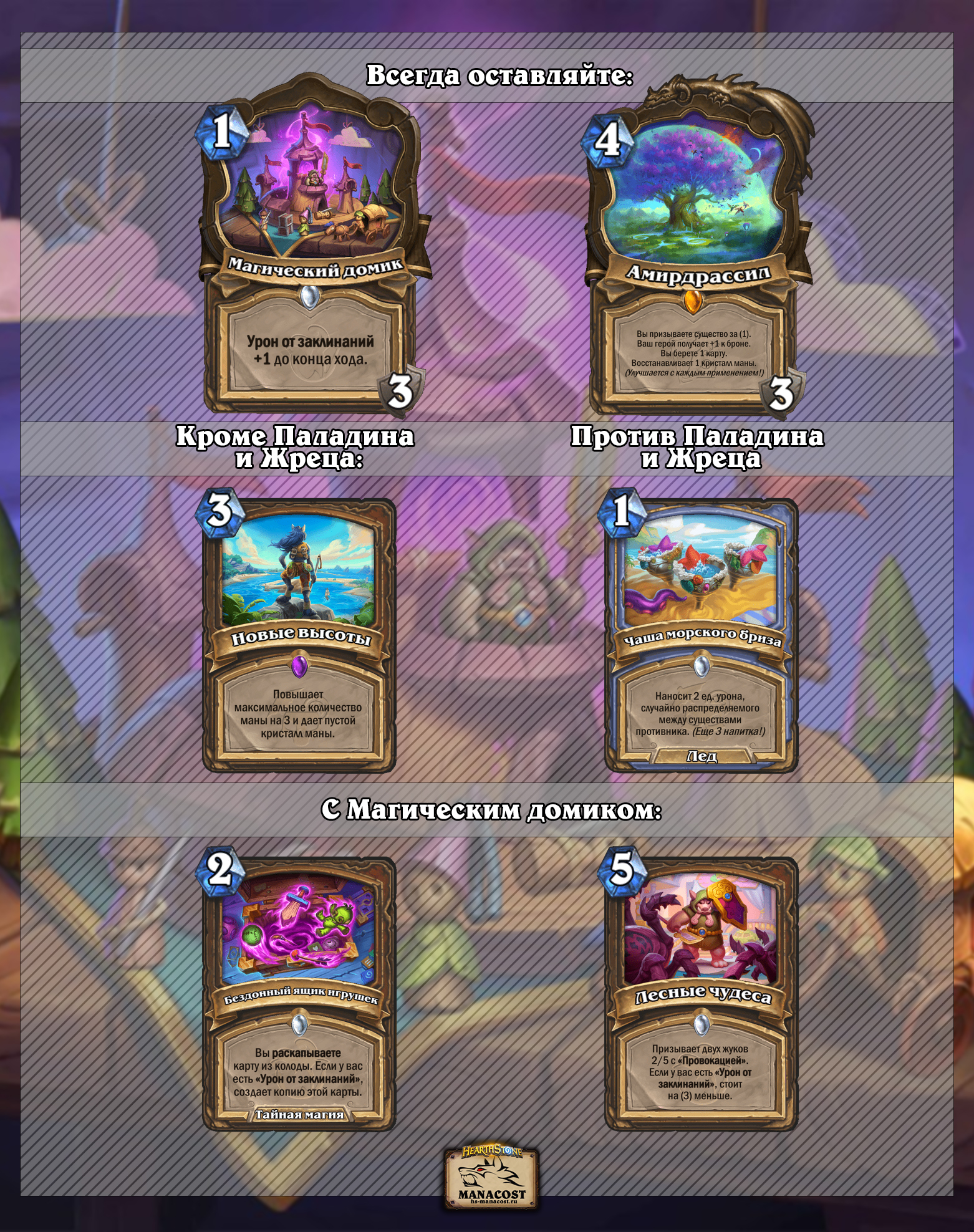 Магический домик — ранний активатор сразу нескольких карт, главный помощник в зачистке стола и один из источников летального урона. Бездонный ящик игрушек и Лесные чудеса становятся во много раз лучше, если у вас уже есть Магический домик на старте. Очень эффективно усиливается Чаша морского бриза. А последний заряд обычно участвует в летальном уроне.