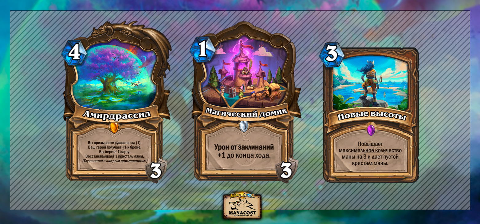 Новые высоты — рамп, который очень поможет в мидгейме с большими зачистками, а также ускорит выход к более тяжелым картам. Рамп не является ключевой механикой СПД Друида, и колода может побеждать без него (особенно если зашел Амирдрассил), но с ним все же будет комфортнее. Не пригодится заклинание только в агро матч-апах (Паладин, Жрец).