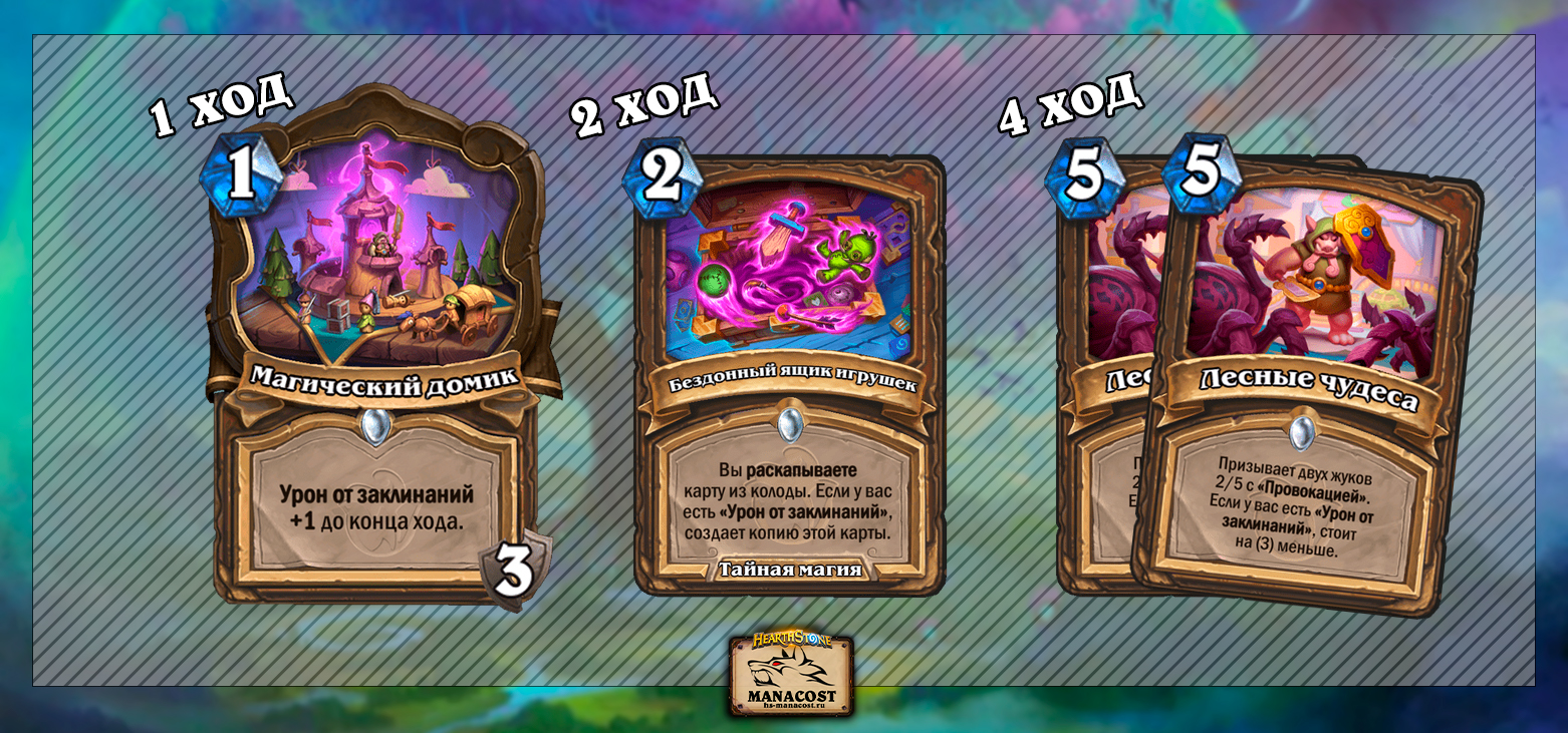 Исходя из этого, классический старт СПД Друида включает в себя Магический домик, который могут продолжить Бездонный ящик игрушек или Лесные чудеса. Еще лучше, если вы раскопаете и скопируете Лесные чудеса ящиком игрушек. Такая кривая почти идеальная, потому что ровно в кривую на 4-м ходу откроется 2-й заряд Магического домика и позволит сыграть обе копии Лесных чудес.