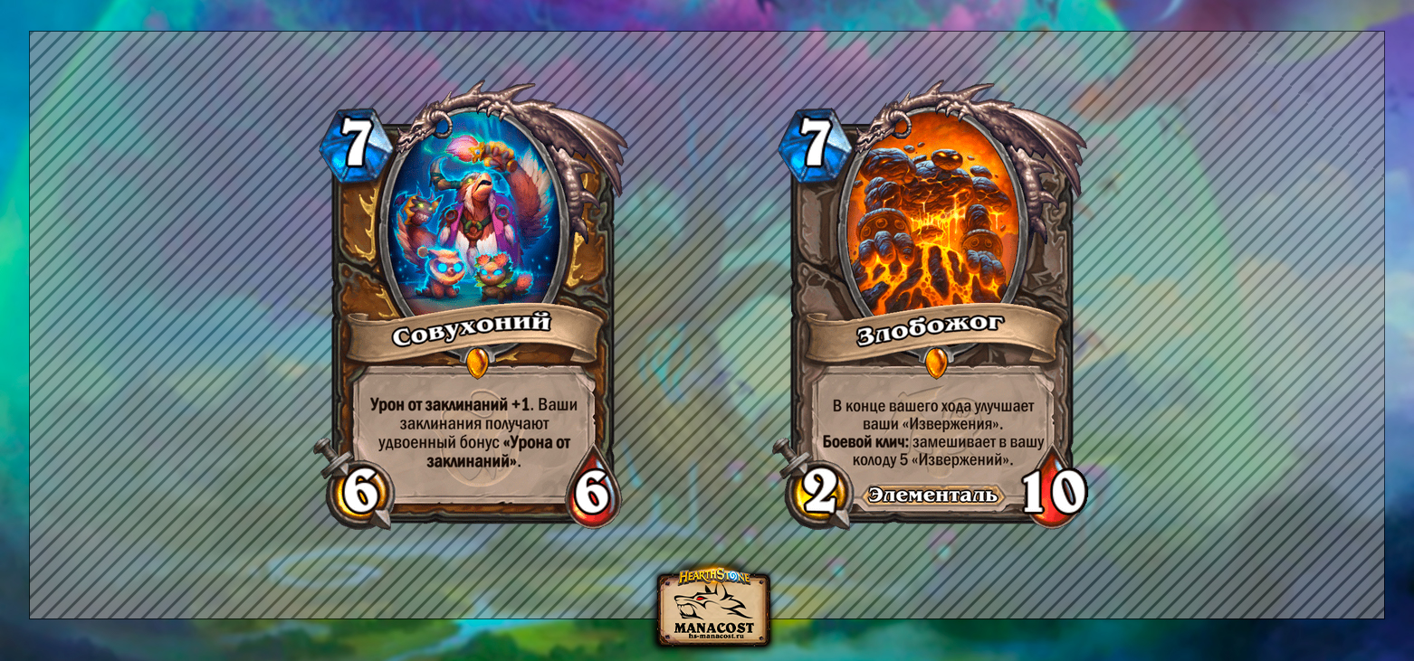 Злобожог выступает, скорее, как отдельный финишер, нежели помощник Совухония. Конечно, в идеальном случае вы замешаете Извержения, не возьмете их сразу, а затем под Совухонием достанете из колоды сумасшедшее АоЕ. Но провернуть такое удастся далеко не всегда. Что удается, так это Извержения под Эфириалом-оракулом, который их тут же доберет. Иногда оба существа можно сыграть даже в один ход, если есть другие источники СПД и Сверкающий флакон.