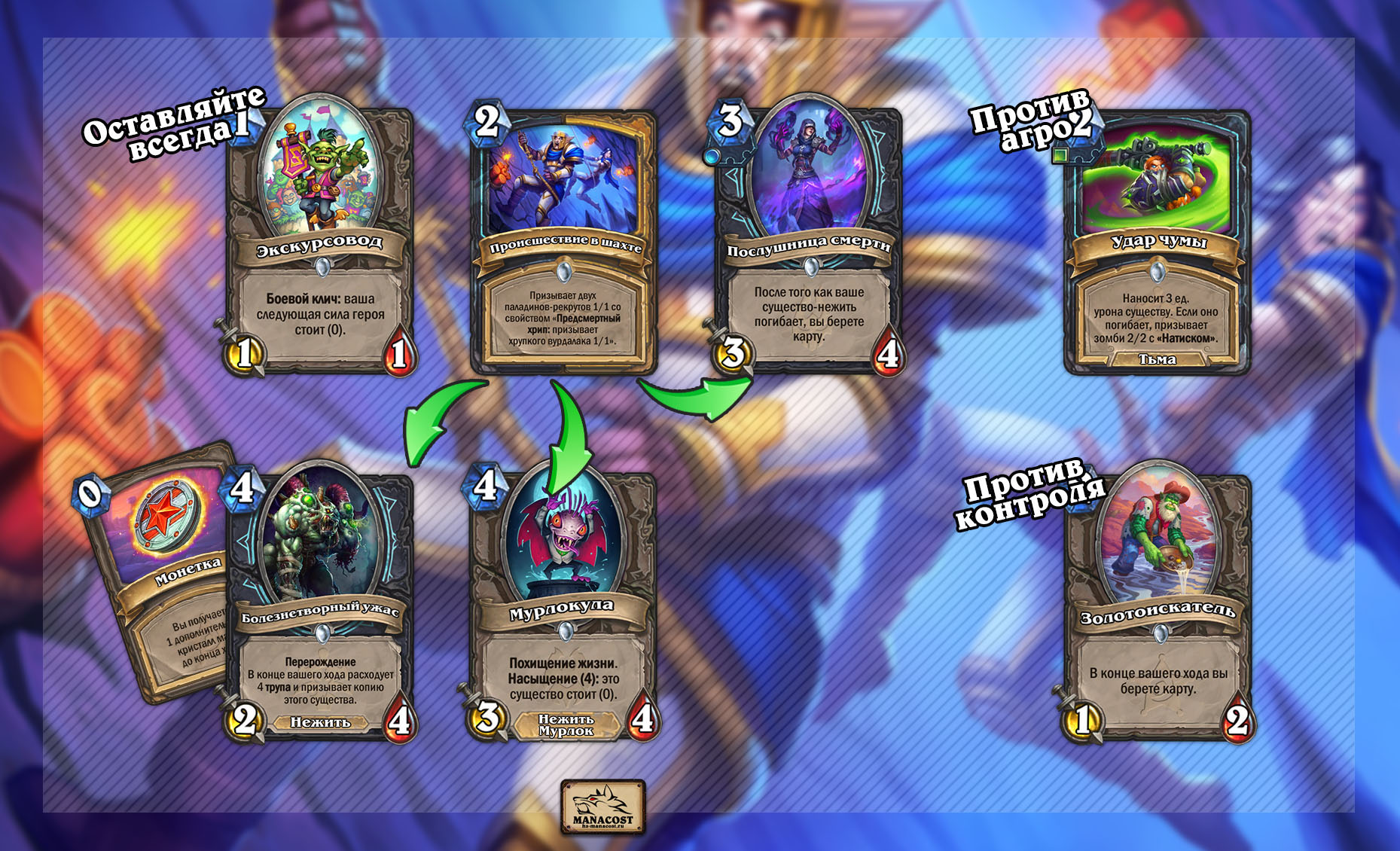 В получении трупов на помощь как раз и приходит новое Происшествие в шахте. Карта генерирует сразу 4 трупа и очень эффективно помогает с ранними разменами на столе. Сейчас это безоговорочно сильнейшая карта в колоде. Важно знать, что Хрупкие вурдалаки погибают сами только в конце ВАШЕГО хода, поэтому не стоит бояться, что противник просто разобьет Паладинов-рекрутов и вы останетесь ни с чем.