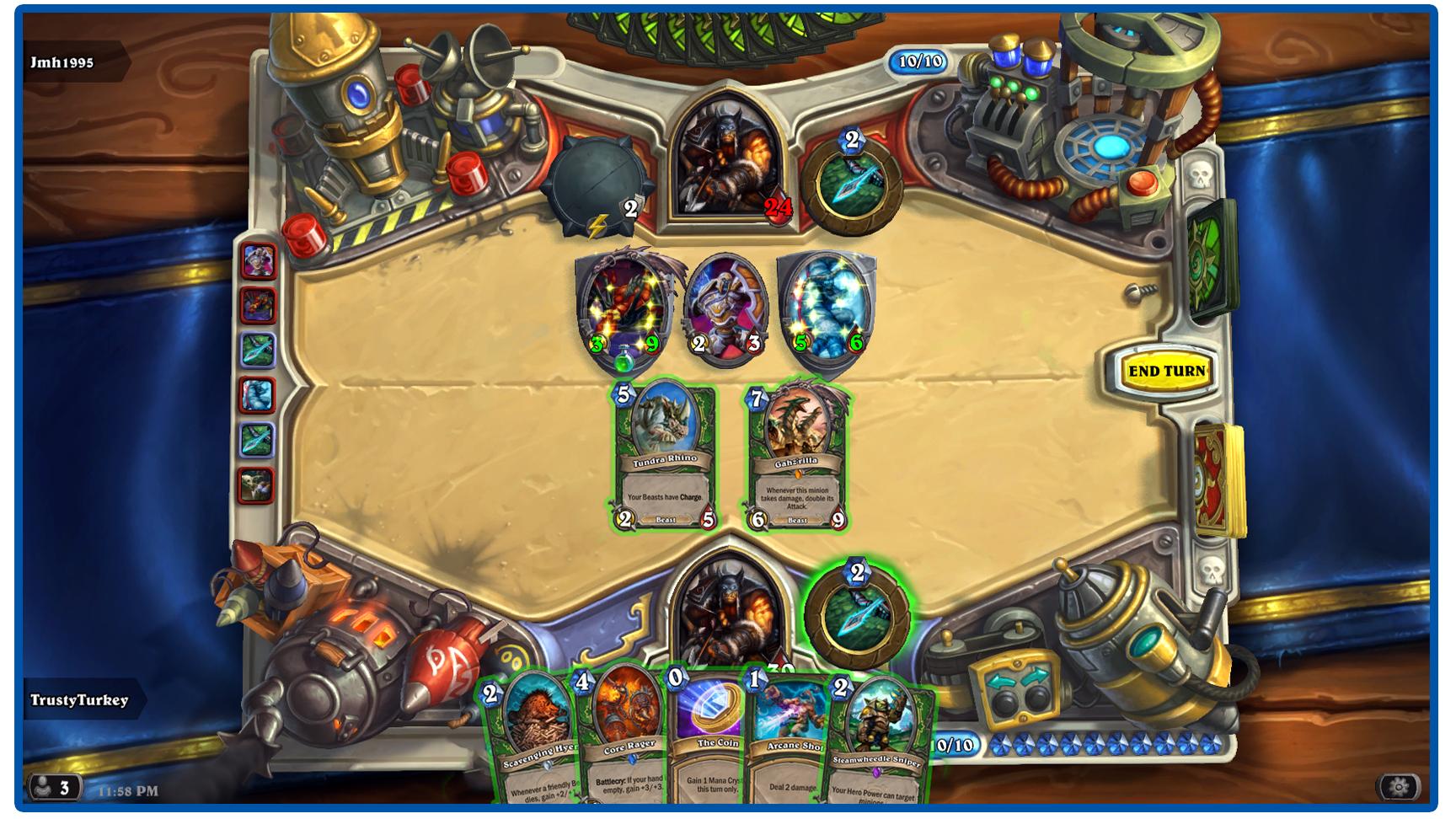 Подождите, что?! 2 охотника достигли 10 маны?! Да, в параллельной вселенной Контроль Охотники являются образцом, и в этой игре мы оба боролись некоторое время с провокаторами друг друга. После сыгранного Газ’риллы, наш оппонент не имел возможности избавиться от него и вместо этого решил принять «максимальную защиту». Он недавно получил Мексну из Тенетника, выставил Йети и дал им обоим провокацию Защитником Аргуса. Оказывается, мы имеем летал!