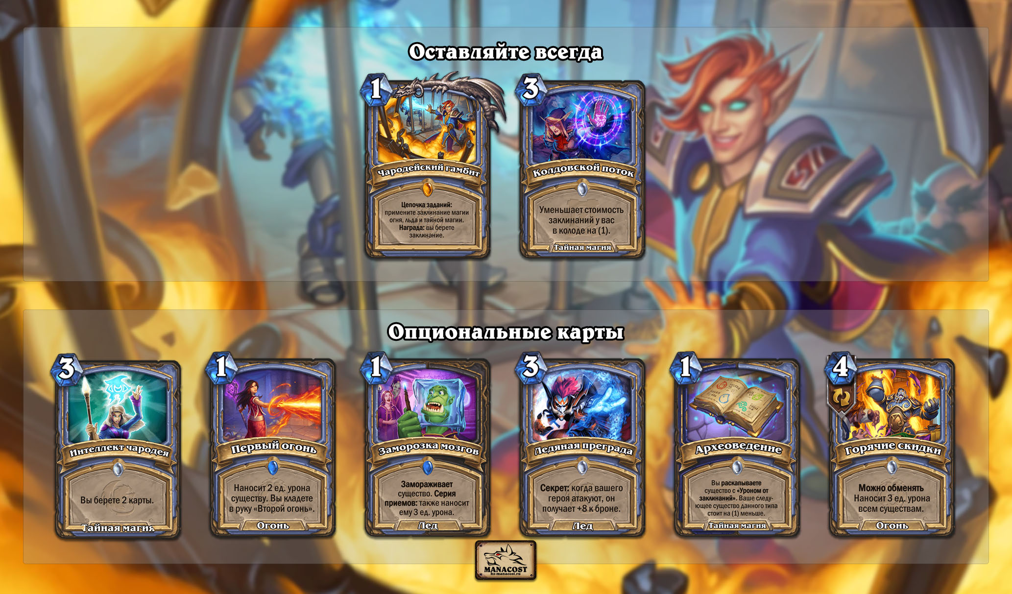 [tape-deck id=203292]Среди топовых игроков ходит мнение, что Маг-универсал из Мертвых копей — это потрясающая новинка для Квест Мага. Колода использует сразу 3 школы заклинаний, а цель Мага — быстрее найти все карты для выполнения квеста и убийства оппонента, и Маг-универсал отлично вписывается в этот план на игру. Минус карты в том, что она иногда будет портить восстановление маны Освежающей ключевой воды.