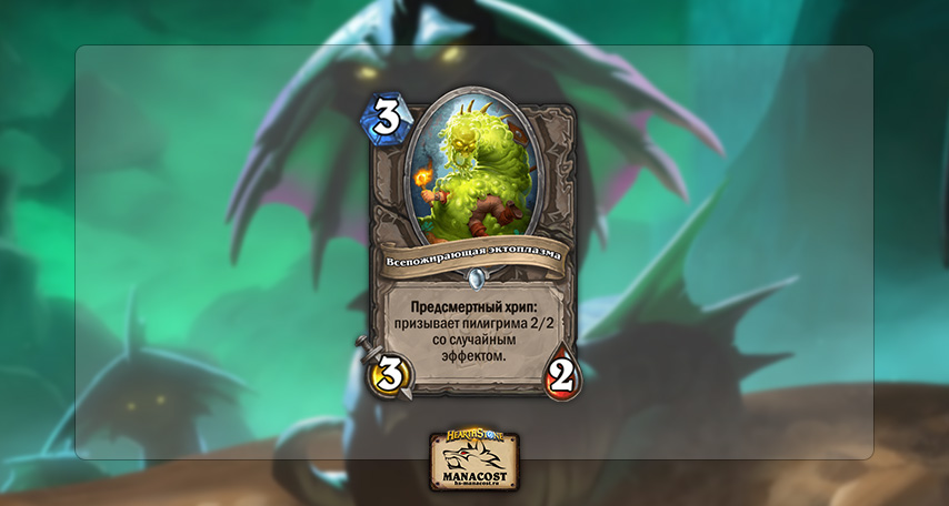 Всепожирающая эктоплазма, пожалуй, самая лучшая карта из всего мини-набора с механикой пилигримов. За 3 маны вы получаете неплохое число характеристик, а также возможность получить один из сильных эффектов на пилигриме. В сравнении с другими картами Всепожирающая эктоплазма очень напоминает Пилотируемого крошшера.