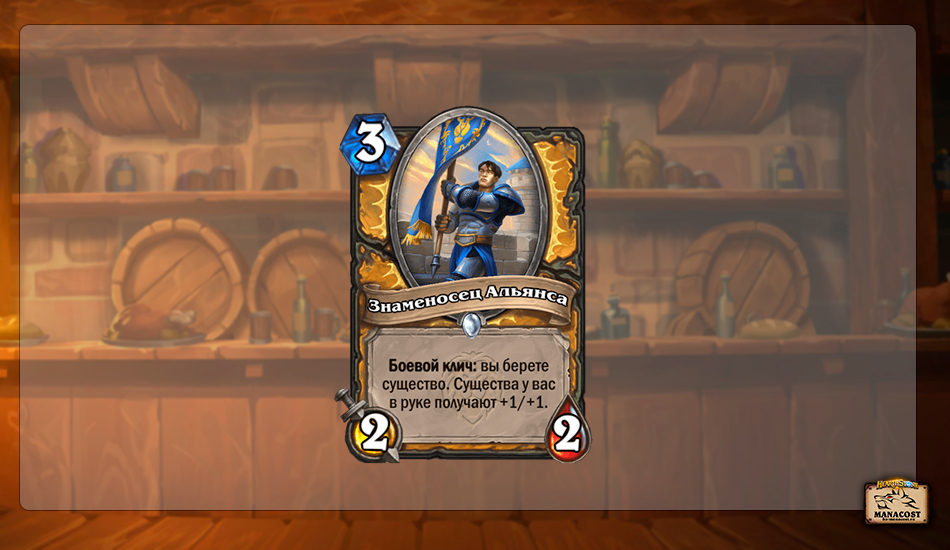 О Знаменосце Альянса можно было бы рассказать вместе с другими картами Хэндбафф Паладина. Но возможно, этот третий дроп так хорош, что его могут играть и другие архетипы класса, даже если бафф существ в руке не будет их основной задачей.