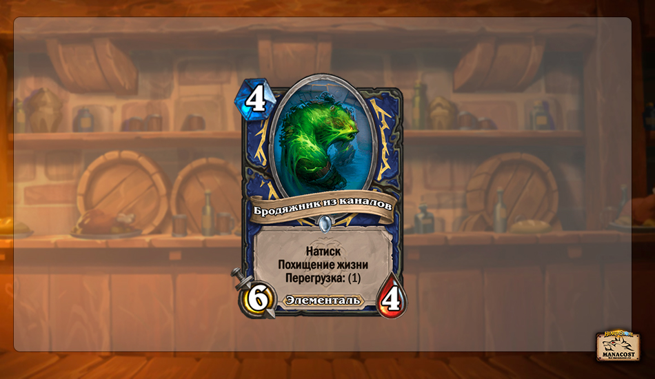 Еще один мощный элементаль в арсенале Шамана. Его могут играть как темповые Элем Шаманы в синергии с другими существами этой расы, так и медленные архетипы класса просто как самостоятельную угрозу. Бродяжник из каналов одновременно и ремувал, и мощный способ исцеления, а перегрузка в 1 маны открывает синергии с классовой цепочкой квестов.