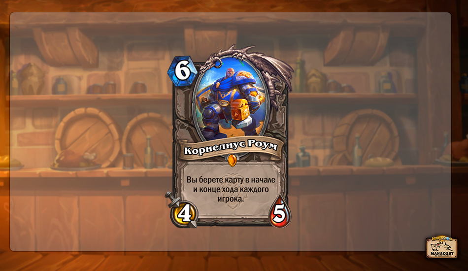 Лучшая нейтральная легендарка дополнения, которая вписывается в целый ряд колод и классов. Корнелиуса Роума часто берут в темповые и агрессивные сборки, которым не хватает источников добора. К 6 ходу они могут истощить руку оппонента так, что у него не останется ремувала на 4/5 угрозу. В этом случае Карнелиус Роум чуть ли не самостоятельно принесет победу.