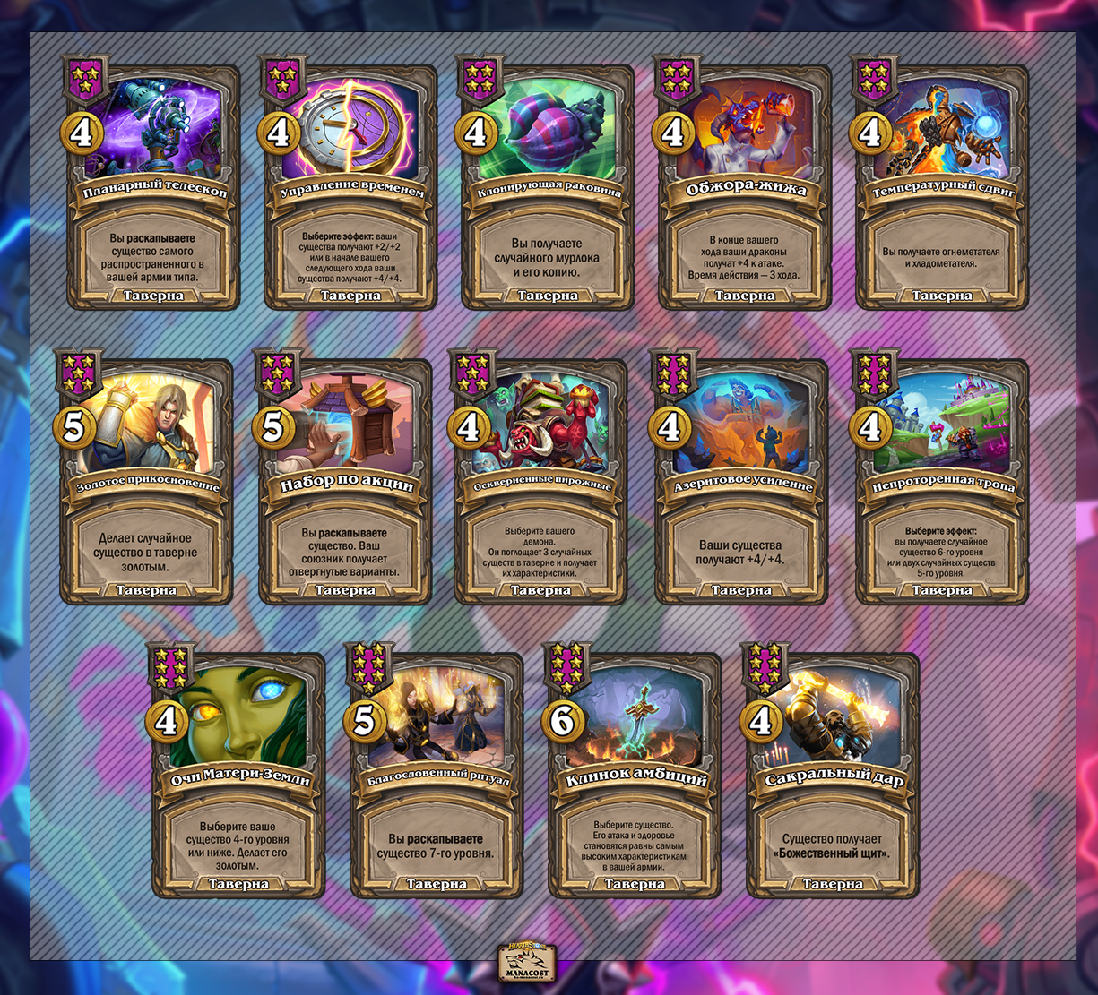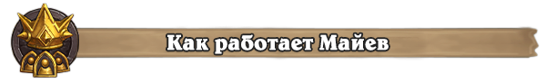 Со старта Майев играет в стиле Рафаама, то есть старается каждый ход использовать силу героя, а таверну обычно улучшает в ходы с 6 и 7 монетами. Но можно сделать это и раньше, если зайдет много экономически выгодных карт.