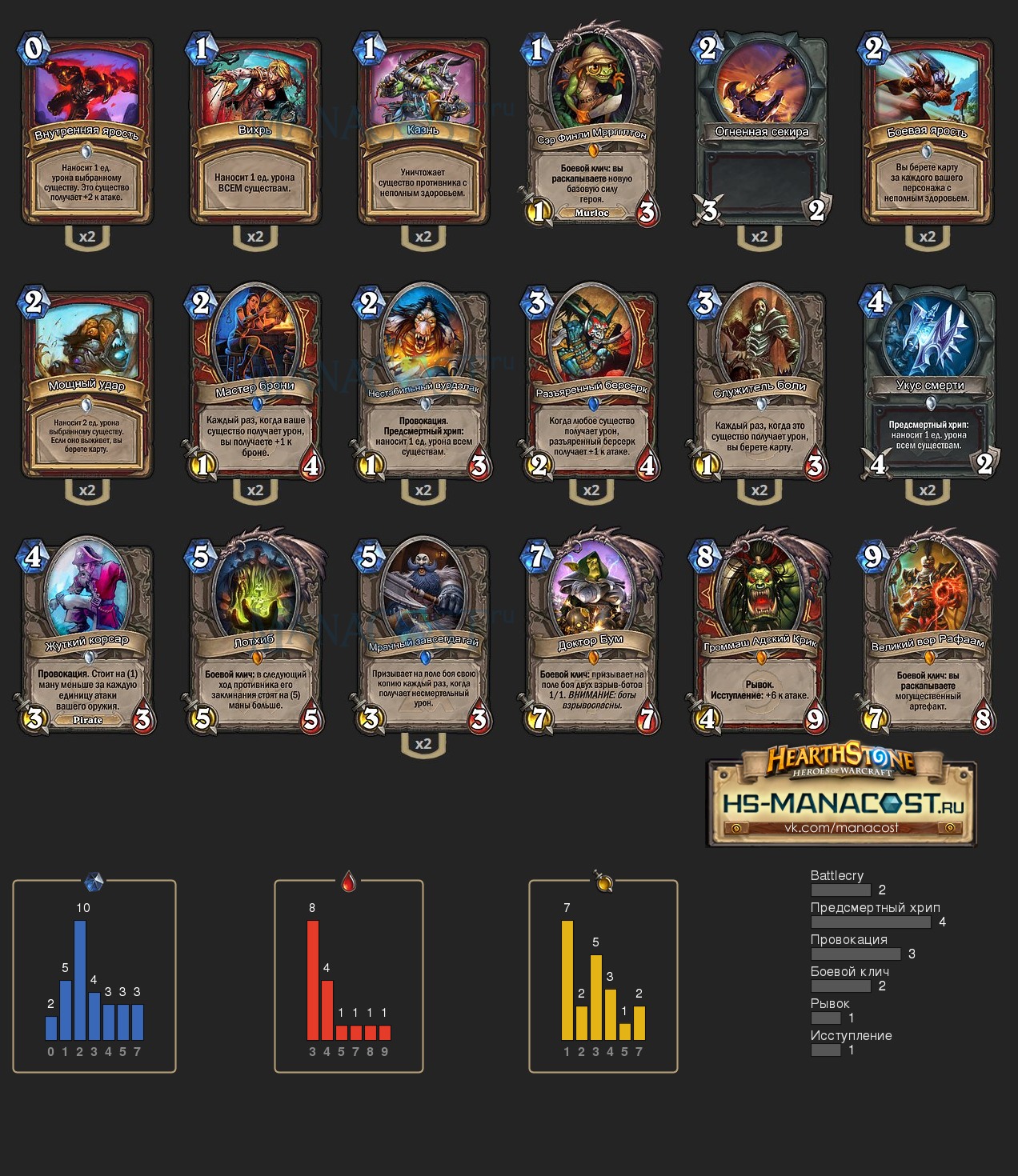 Казалось, что хуже уже не будет, но с выходом Стандартного режима Патрон Воин потерял свое самое сильное оружие — Укус смерти. Но разработчики все же предоставили “патроноводам” новый эффективный инструмент. Теперь “раскруткой” Завсегдатаев занимается Буйный вурдалак, а место Пилотируемого Крошшера занял Храбрец Кровавого Копыта. Вместе с этим, стиль игры Патрон Воина стал немного агрессивнее, некоторые сборки даже берут Рагнароса или Лироя Дженкинса для быстрого добивания своего оппонента. Мы же хотим представить более классическую версию Патрон Воина, эффективно справляющуюся с Зоолоками и прочими быстрыми колодами, опирающимися на контроль стола через маленьких существ. Также есть хорошие шансы в мидрейндж и контроль матч-апах, что делает Патрон Воина отличным выбором для продвижения в рейтинге.