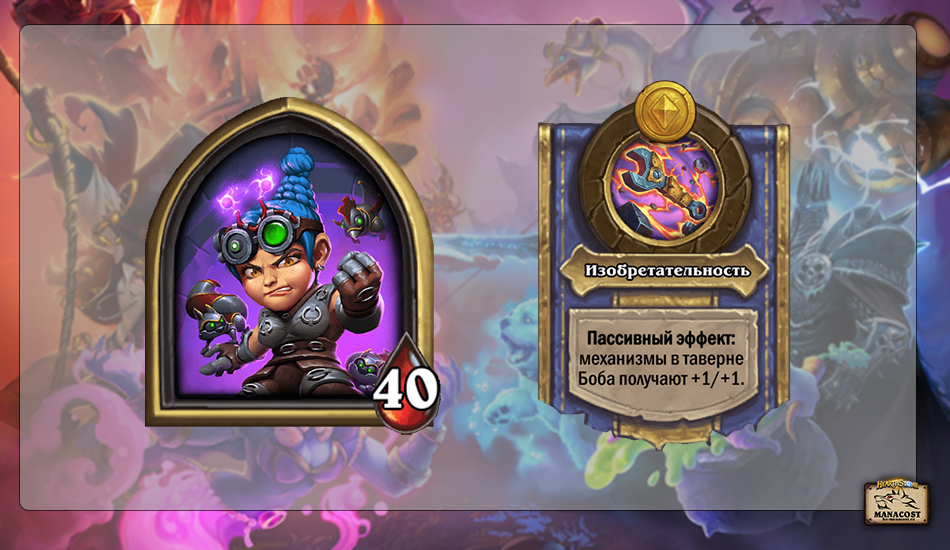 Сила героя Миллифисент Манашторм — одна из самых простых в игре. Все мехи в таверне получают бафф +1/+1. Важно, что этот бафф не получат механизмы, которых вы раскопаете с триплета или сгенерируете другим способном, например с помощью Дорнозму.