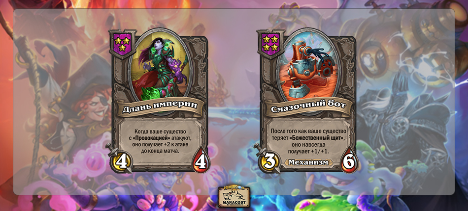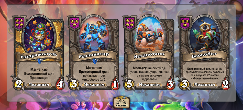 На этих уровнях полезны почти что все механизмы и их бафферы. Особое внимание обращайте на Раздражодуля, Репликатора, Механотанк и Блокобота. Если рано есть много провокаций или божественных щитов, задумайтесь о Длани империи и Смазочном боте. Важен и Защитник Аргуса — старайтесь дать бафф провокации 2-4 существам на столе, чтобы защитить компаньона и Барона Ривендера от раннего снайпа.