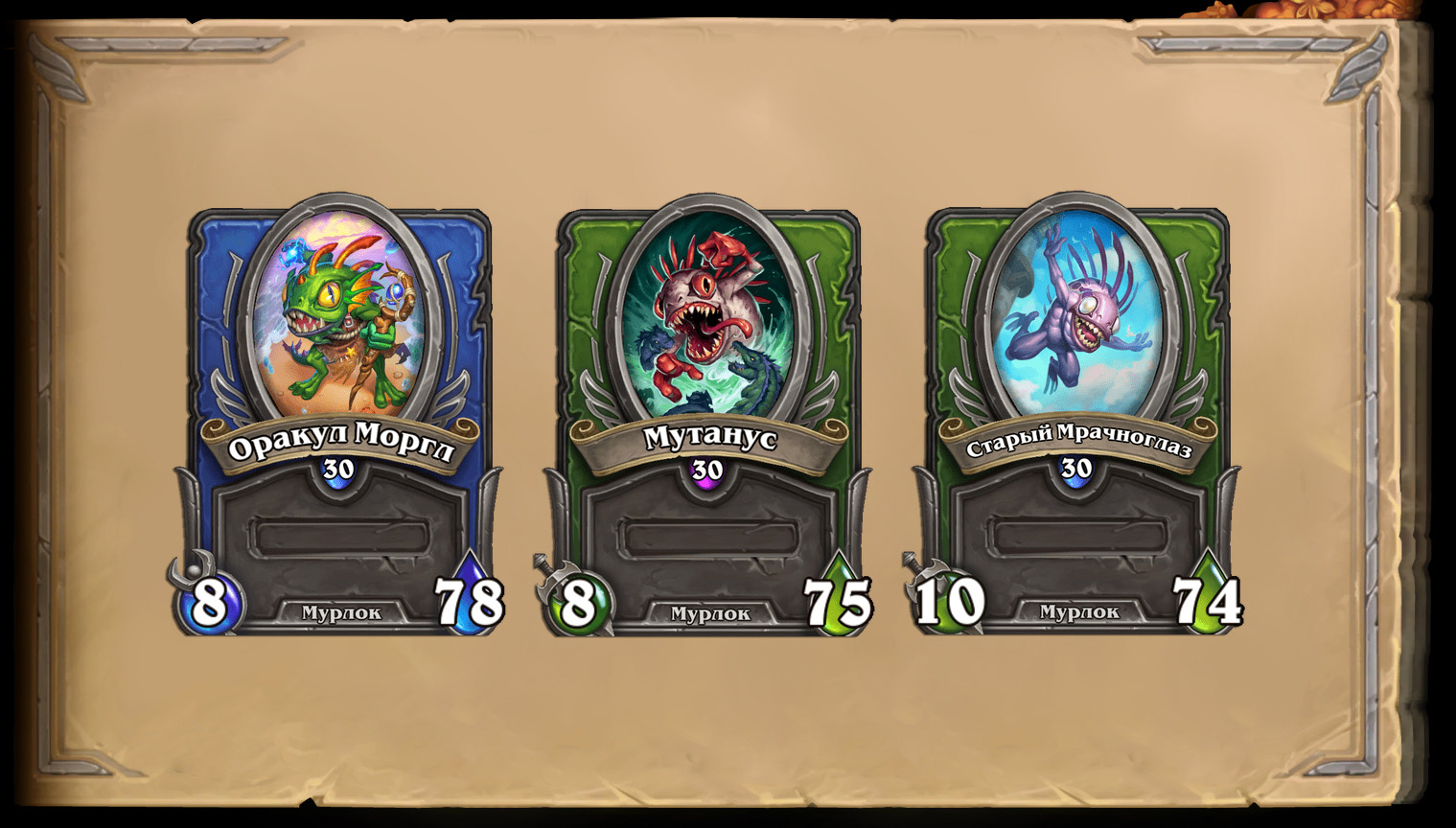 В данном случае тройка тоже на абсолютно бюджетная, поскольку в игре только 3 мурлока, один из которых эпический. Но она точно одна из самых фановых. Мурлоки плохи в PvP, поскольку им нужно время разогнаться и они уязвимы к заклинаниям, которые достают Моргла из-за провокации. А вот с обычными атаками отлично справляется Мутанус, и со временем он становится только опаснее благодаря баффам.