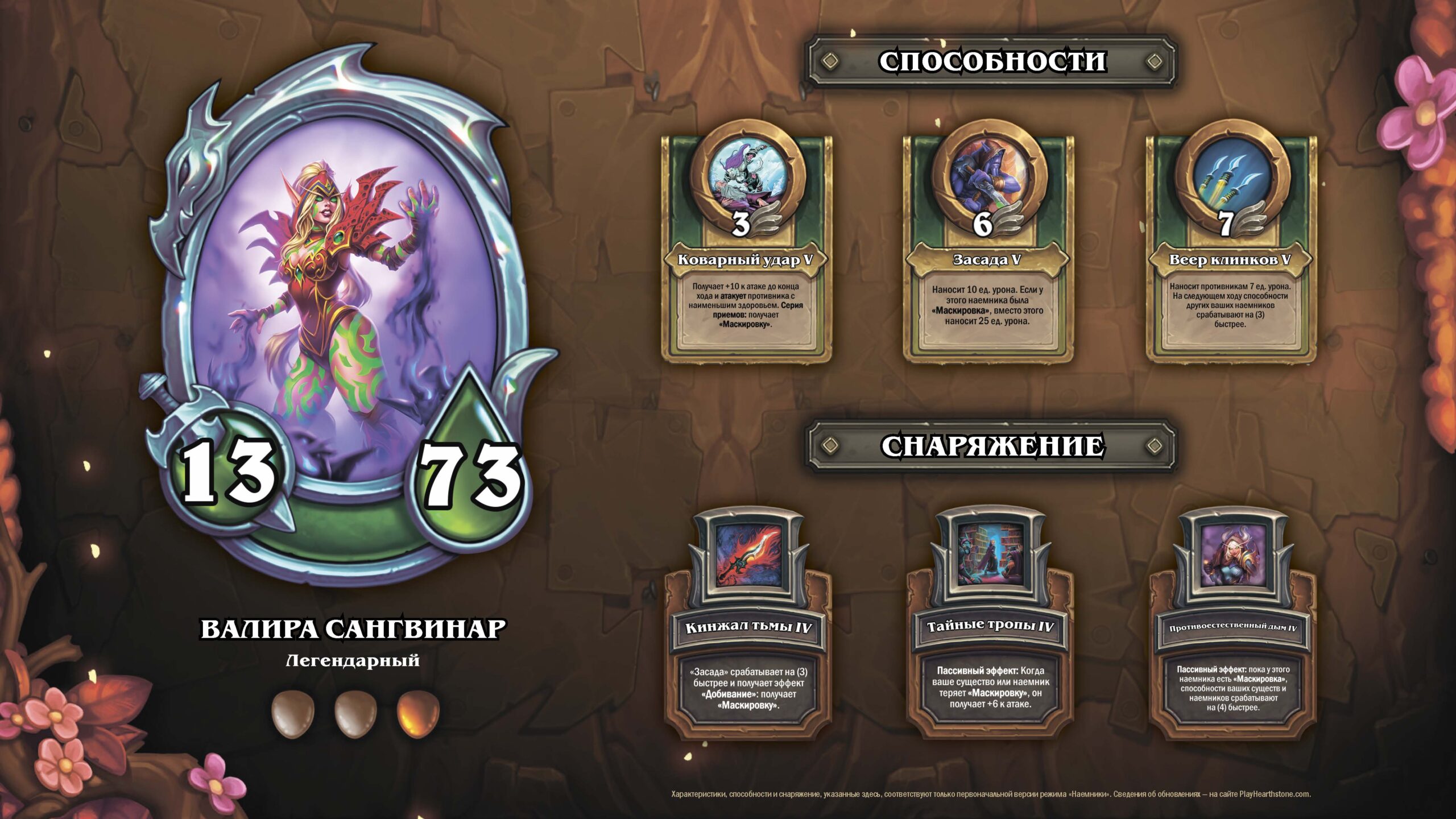 Валира Сангвинар — новый герой Наемников, которого добавили в патче 22.0. Пусть с выхода обновления прошло не так много времени, многие уже убеждены, что Валира — один из топовых наемников режима, а возможно и разрушитель меты. Подобрали четыре хороших отряда с Валирой, которыми можно играть в начале декабрьского рейтингового сезона. Читайте так же: Получить Валиру Сангвинар не так уж легко. Монеты с нее падают только в 13 миссии Черной горы — проходить ее снова и снова можно, но фарм 500 монет займет очень много времени. Получить нового наемника можно, открыв бустеры режима. Их можно купить за реальные деньги или золото, а еще нафармить с квестов. Проходите индивидуальные цепочки заданий любых наемников (желательно метовых и сильных) до конца — всего у каждого наемника 18 квестов. За последние три задания в награду вы получите не только монеты наемника, но и бустеры нового режима. Как только Валира окажется в коллекции, прокачать ее не так уж сложно. Замаксить нужно только один предмет — уже после этого Валиру можно брать в топовые отряды. Хотя полезно раскачать и способности хотя бы до 3 уровня — особенно первую. Как играть: всегда используйте первую способность на первый ход, чтобы уйти в маскировку и дать бафф к скорости наемникам на столе. На следующие ходы продолжайте использовать первую способность, а если атака нанесет слишком много урона Валире, не делайте ей ничего — пусть она просто стоит в маскировке до конца боя или смерти от АоЕ эффектов. Засаду используйте в особых случаях, чтобы добить мощного наемника противника. Обычно способность играют уже во второй половине боя или в ситуациях, если бафф к скорости не так важен. Веер клинков ситуативен и частично выполняет ту же функцию, что и простое нахождение в маскировке, но хуже. Играйте Веер клинков, если нужно добить 1-2 цели с низким запасом здоровья. Самуро + Громмаш + Валира + Вол’джин + Натали + Кок Пирожок Классический стартер Самуро теперь стал еще сильнее из-за баффа к скорости Валиры. На второй ход Самуро сможет вновь атаковать своей первой способностью — теперь со скоростью 0. Второй скилл Громмаша позволит Самуро атаковать дважды и ваншотнуть наемников оппонента. Дополнением стартовой тройки станут быстрые синергии Тьмы и популярнейший Кок Пирожок. Все их способности также можно использовать со скоростью 0 из-за баффа Валиры. Диабло + Корнелиус + Валира + Малфурион + Бру’кан + Кок Пирожок Интересная стартовая тройка не так сильна на первый ход, но Корнелиус надежно защитит Диабло и Валиру от снайпа. На следующий ход Диабло сможет сыграть свою сильнейшую АоЕ способность со скоростью 2. Бру’кана ставьте только через два хода, чтобы у вас сразу же была возможность использовать его третью способность. Не забывайте, что у Кока Пирожка тоже есть способности школы Природы, так что он хорошо работает с Малфурионом. Тралл + Громмаш + Валира + Тавиш + Вол’джин + Тамсин Как и Самуро, Тралл дважды атакует на первый ход и может сразу же ваншотнуть одного из наемников оппонента. Громмашем постарайтесь нарушить планы противника, чтобы тот не убрал со стола Тралла в свой первый ход. Сейчас заснайпить защитника на первый ход не так легко, потому что мало кто начинает бой с двух наносящих урон Заклинателей. Отряд ситуативный и вариативный. Вы можете открываться не только Траллом, Громмаше