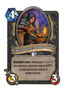 - До изменения: «Боевой клич: получает +1/+1 за каждую карту ШРУ, разыгранную вами в этом матче».