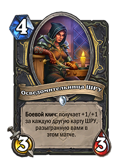 - До изменения: «Боевой клич: получает +1/+1 за каждую карту ШРУ, разыгранную вами в этом матче».
