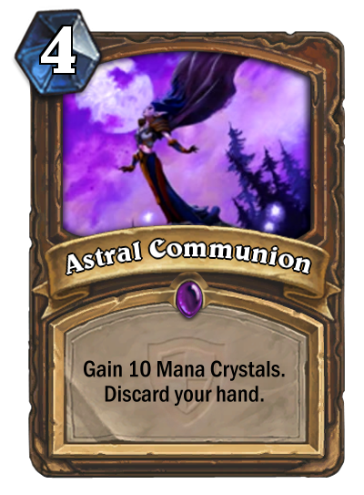 Эти два эффекты уравновешивают друг друга, вы получаете сразу 10 кристаллов маны, но сбрасываете всю свою руку. Эта карта очень специфична в использовании. Важно понимать, что 10 кристаллов маны даются вам навсегда, до конца матча. Если сравнивать ее с Буйным ростом, который является хорошей картой Друида, то можно заметить, что Буйный рост дает пустой кристалл маны, вы не получаете его прямо сейчас. А вот Дар природы работает так, что вы получаете кристаллы маны незамедлительно. Например, если вы играете Дар природы на 5 ходу и выбираете получение двух кристаллов маны, то у вас на этом же ходу будет два кристалла. И в случае с Astral Communion он тоже незамедлительно даст вам 10 кристаллов, правда, разыграть ничего вы не сможете, так как скинули всю свою руку, но на следующий ход у вас снова будет 10 кристаллов манны.