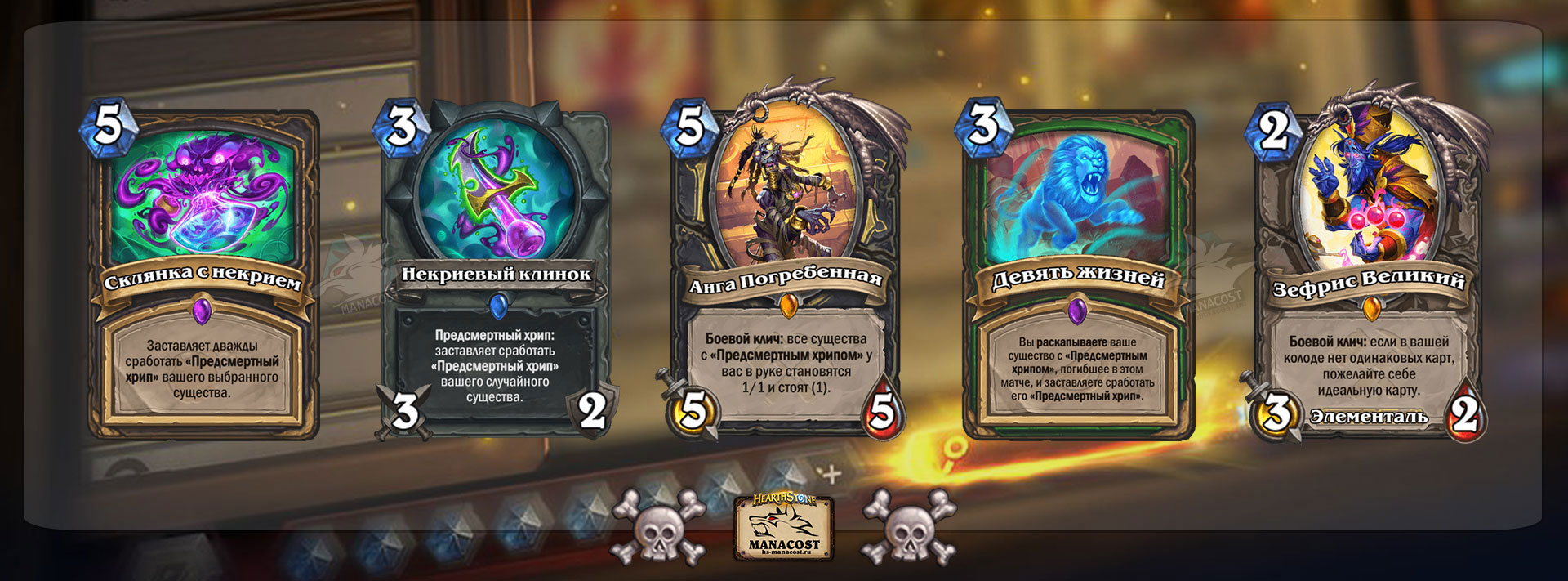 Эти карты не взаимодействуют с Н’Зотом напрямую, но могут помочь архетипам с предсмертными хрипами раскрыть свой потенциал. Много мощных инструментов есть у Разбойника: Анга Погребенная, Некриевый клинок и Склянка с некрием. Их дополнит и Н’Зот, но он не решит главную проблему класса: у него просто нет хороших существ с предсмертным хрипом, которые бы синергировали с этими эффектами.