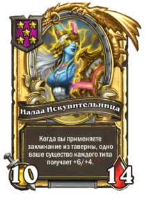 • До изменения: 5 атаки, 6 здоровья. Когда вы применяете заклинание из таверны, одно ваше существо каждого типа получает +2/+1.