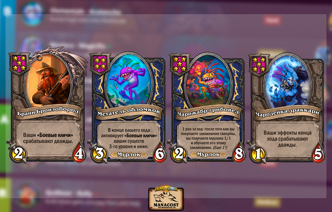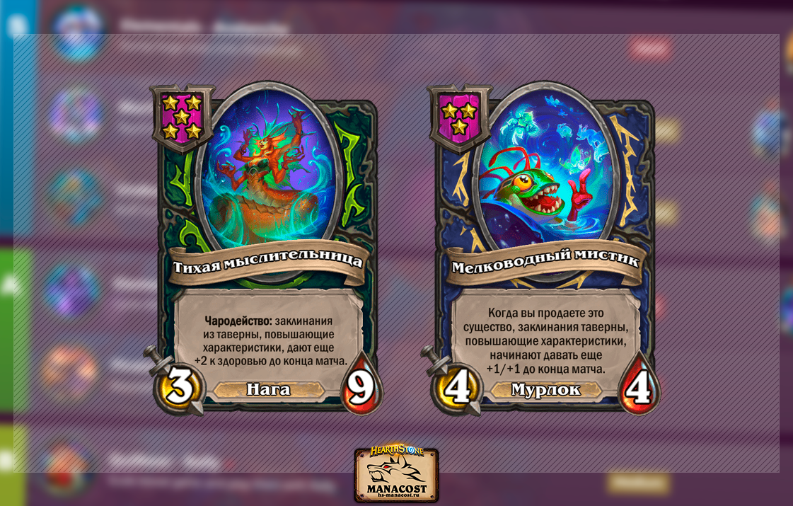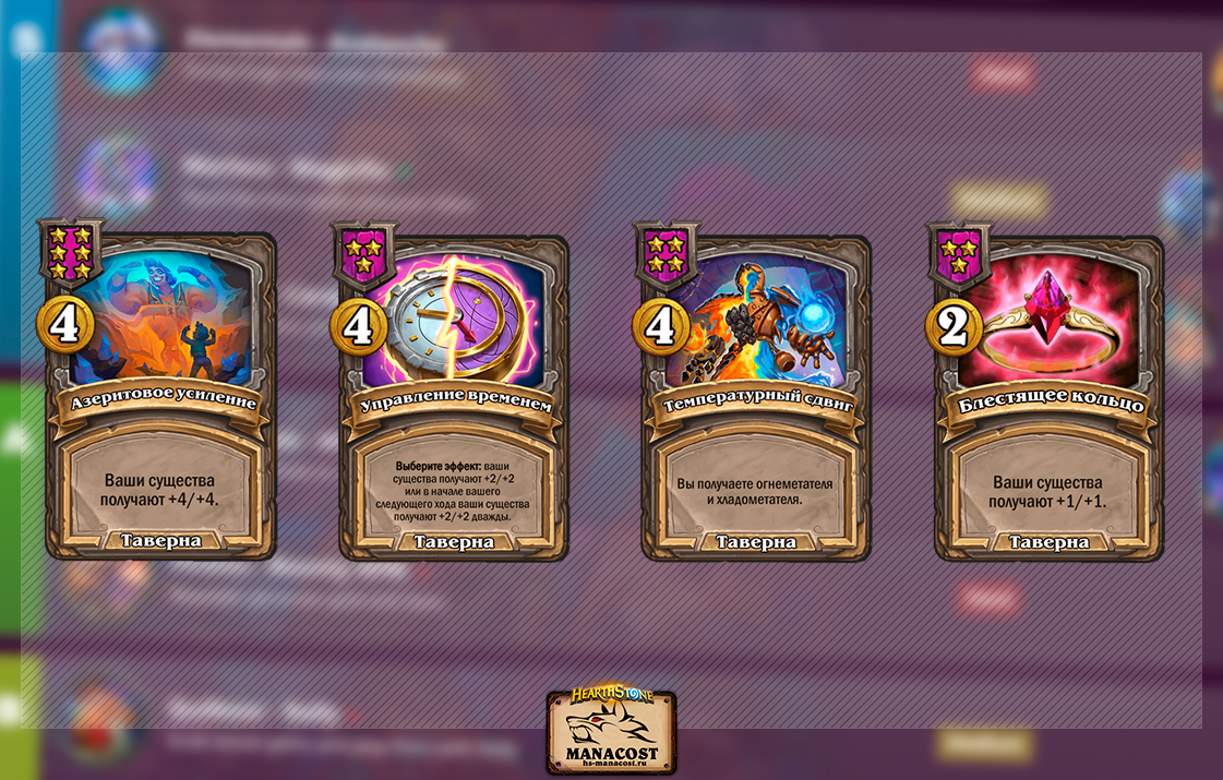 При игре с Блестящим кольцом и Управлением временем обязательно ищите Кудесника Скверны, Тихую мыслительницу или Мелководного мистика. Эти карты усиливают заклинания таверны и делают ваш стол значительно сильнее.