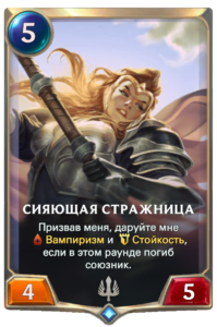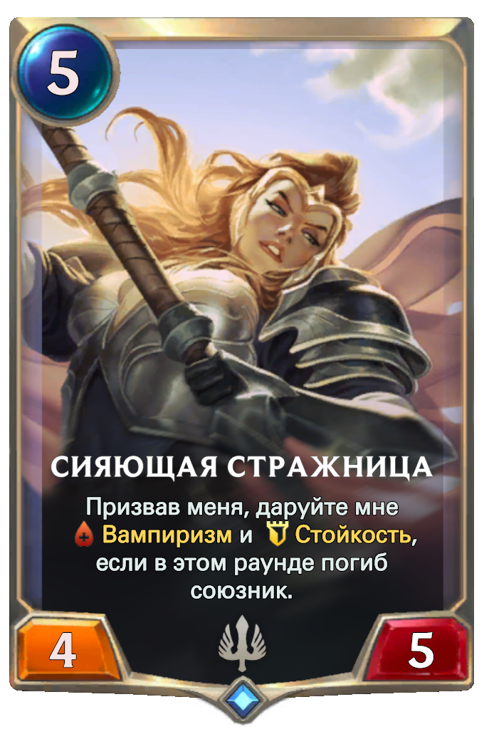 Сработавший эффект Сияющей стражницы слишком резко переламывает ход матча, особенно в играх с некоторыми противниками. Мы решили дать второй стороне больше возможностей победить эту карту, а не просто пытаться справиться с ее присутствием. Она останется мощным бойцом обороны, но со сниженным показателем силы ее атаки (и Вампиризм) будут менее эффективны. Бойцы и чемпионы противника (особенно Дариус и Гекарим) смогут более выгодно проводить атаки в присутствии Стражницы.