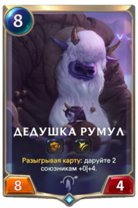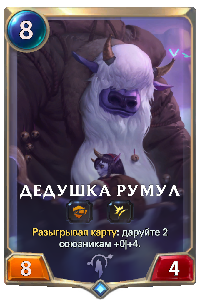 ДЕДУШКА РУМУЛ — РАЗЫГРЫВАЯ КАРТУ: даруйте союзнику +0|+4 → даруйте 2 союзникам +0|+4.