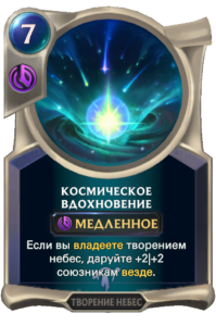 КОСМИЧЕСКОЕ ВДОХНОВЕНИЕ — СТАРОЕ ОПИСАНИЕ: Если вы владеете творением небес, даруйте +2|+2 союзникам везде. Восполните свою ману заклинаний. НОВОЕ ОПИСАНИЕ: Если вы владеете творением небес, даруйте +2|+2 союзникам везде.