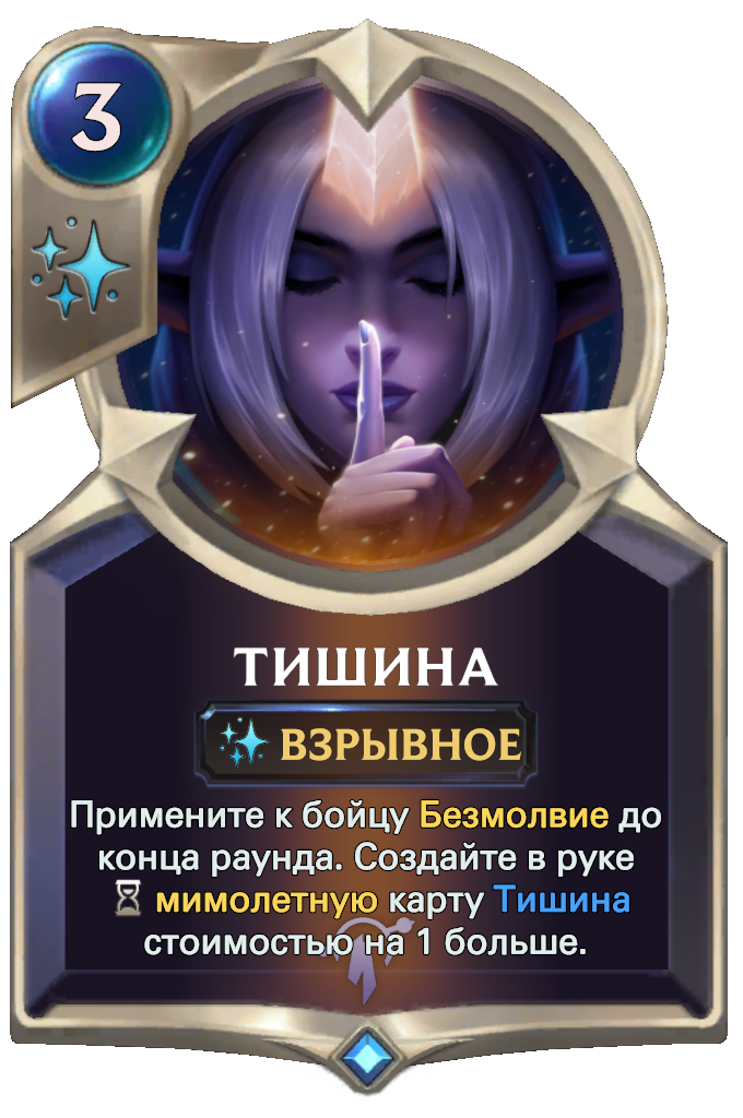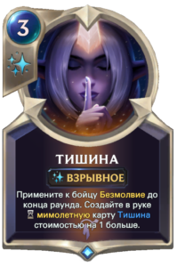 ТИШИНА — СТАРОЕ ОПИСАНИЕ: Примените к бойцу Безмолвие до конца раунда. Создайте в руке мимолетную карту [Тишина]. НОВОЕ ОПИСАНИЕ: Примените к бойцу Безмолвие до конца раунда. Создайте в руке мимолетную карту [Тишина] стоимостью на 1 больше обычного.