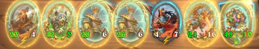 Бронзовый страж отлично работает с Драконом-киборгом из-за эффекта перерождения. Желательно баффнуть Бронзовому стражу провокацию, чтобы перерожденная копия атаковала до того, как убьют Дракона-киборга с бонусом к атаке.