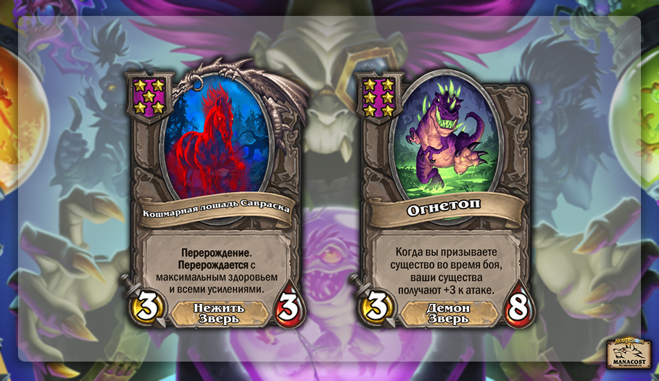 У зверей нет существ с божественными щитами, но есть несколько неплохих синергий с Драконом-киборгом. Первая — Кошмарная лошадь Савраска. Если баффнуть этому юниту божественный щит, то и перерожденная копия его получит. Но в целом такой юнит не будет значительно лучше Бронзового стража или Колосса солнца. Вторая синергия — Огнетоп. У этого зверя-демона нет божественного щита, да и Дракон-киборг ничего не призывает. Но часто этих существ держат вместе, потому что бонусы атаки особенно полезны юнитам с божественным щитом, а пособов призыва в любом лобби достаточно — это Бронзовый страж и Колосс солнца с перерождением, а еще целый ряд других юнитов даже без божественного щита.
