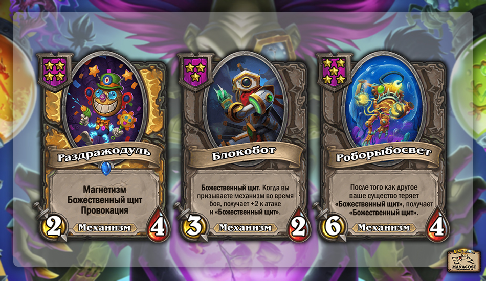 Лучший тип существ для синергии с Драконом-киборгом. Тут есть как просто существа с божественным щитом, так и Раздражодуль, который может баффнуть щит любому меху. Лучшими мехами для синергии с Драконом-киборгом станут Блокобот и Роборыбосвет. Эта пара юнитов может получить божественный щит несколько раз за бой, а значит максимально выгодно использует бафф к атаке Дракона-киборга.