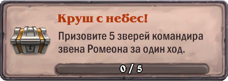 Одно из сложнейших достижений всего дополнения. Во-первых, вы должны дожить до розыгрыша Командира звена Ромеона — в этом поможет Вандар Грозовая Вершина, который удешевит ключевую карту. Во-вторых, у противника должно быть хотя бы 4 существа или пара хрипов, чтобы были цели для атаки. В-третьих, ваши звери должны гарантированно убивать вражеских существ. Представленная Вольная сборка гарантирует последнее благодаря большому числу зверей с ядом в сборке.
