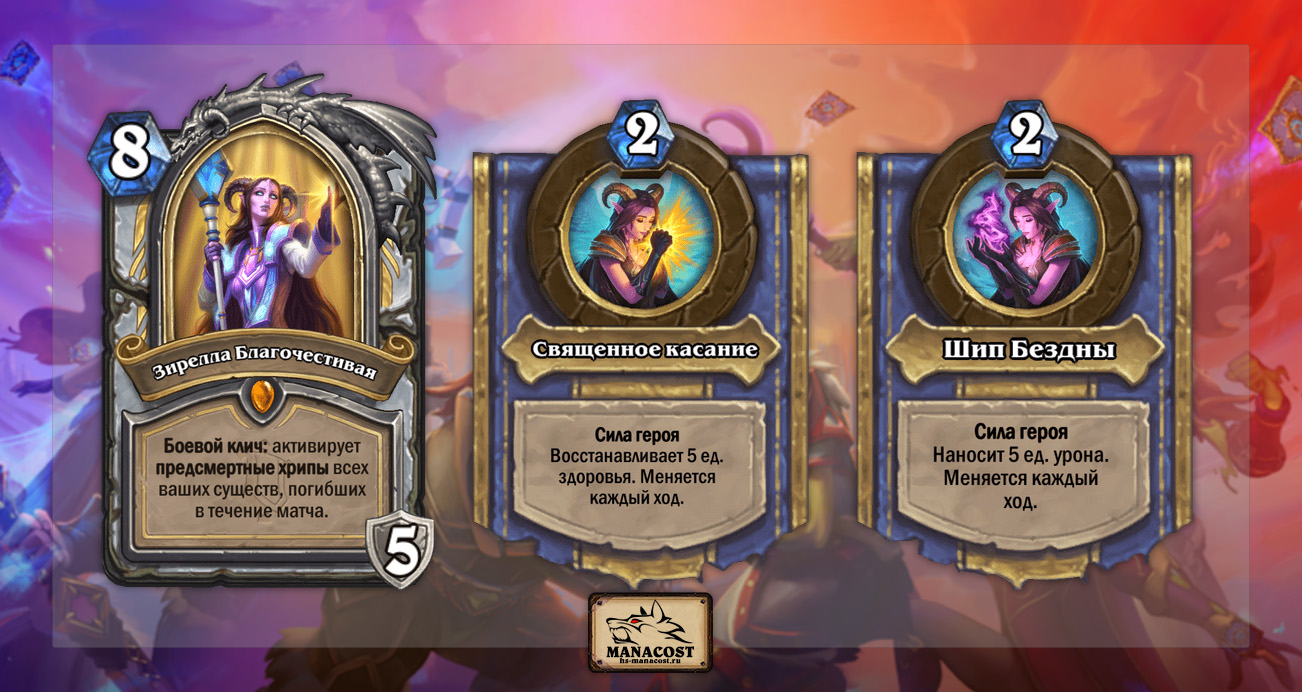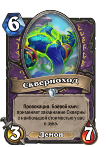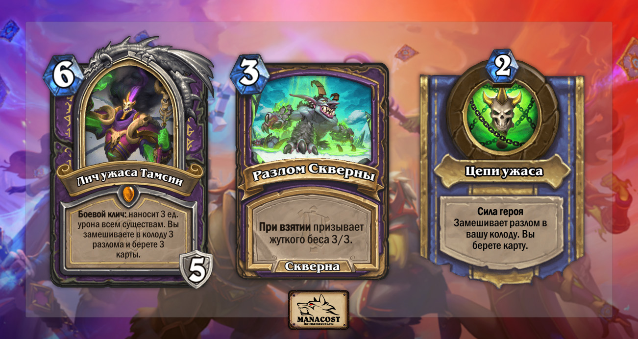 Лич ужаса Тамсин очень многое делает за свою ману (как и еще один герой, о котором речь пойдет дальше). Она похожа на эдакий искаженный аналог Тотального заражения, который чуть меньше и вместо урона кастует АоЕ. Тем не менее все эти эффекты полезны для Контроль Чернокнижника. Важно отметить, что боевой клич сначала замешивает Разломы Скверны и только потом добирает карты, что дает шанс сразу же призвать часть бесов 3/3 на стол.