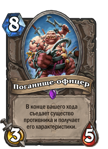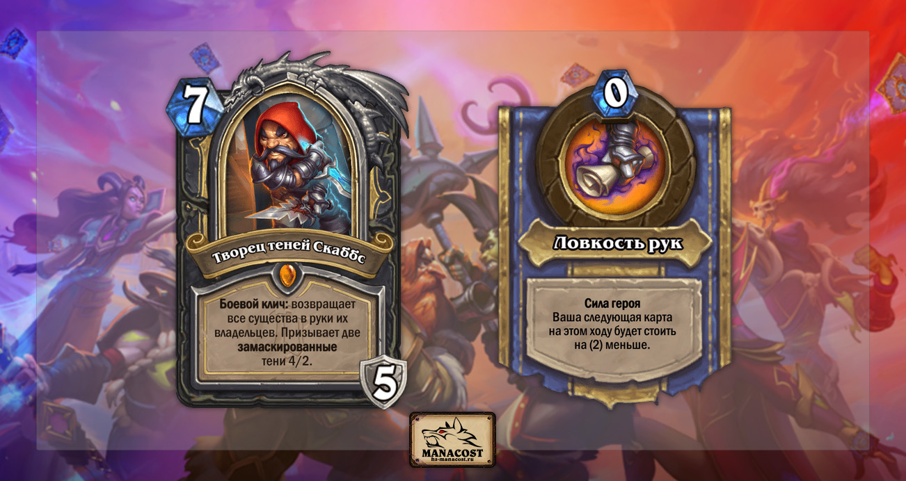 Творец теней Скаббс — это целый вагон и маленькая тележка ресурсов за свою стоимость. Основной эффект карты разыгрывает Исчезновение, которое стоило 6 маны, будучи в Стандарте. Более того, за еще одну ману вы получаете сразу два эквивалента Тропической пантеры и один эквивалент Озарения от силы героя, который можно использовать снова и снова в дальнейшем. И, конечно же, не забываем про 5 брони.