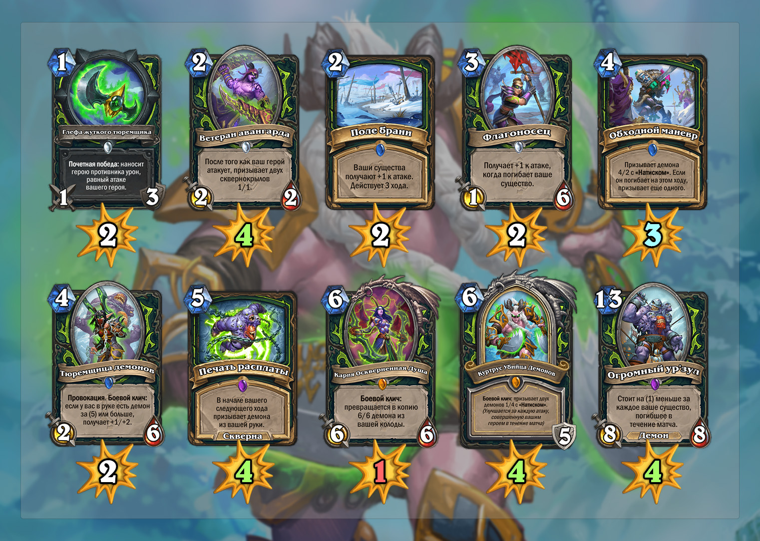 Огромный ур’зул может сбросить свою стоимость очень-очень быстро в колоде с токенами, а бесплатные великаны часто спасали многие классы — спросите Чернокнижника. Печать расплаты, скорее всего, станет лучшей картой Биг ДХ. Чем интересен архетип, так это хорошими угрозами против комбо противников, которые так сложны для биг колод других классов. Ранний Иллидари-инквизитор или Скверносерд-мучитель могут положить конец такой партии.